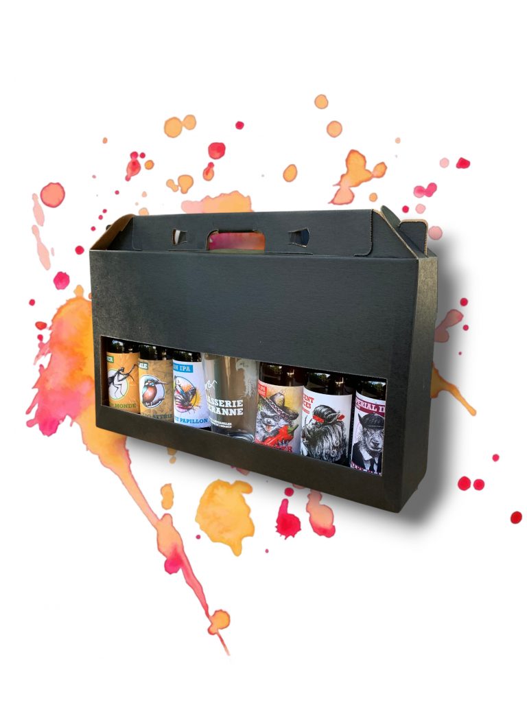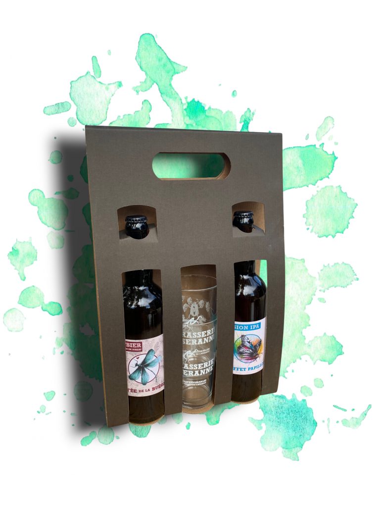 COFFRET CADEAU 1x Verre sérigraphié 33cl1x Biere IPA 33cl1x Biere Witbier au sureau 33cl1x Biere Pale ale 33cl COFFRET GRANDES SOIFS 2x Verres sérigraphiés 25cl2x Bieres au choix 75cl COFFRET BOIS 8x bières aux choix 33cl VALISE DECOUVERTE 1x Verre sérigraphié 33cl6 bières au choix VERRES 4x Verres sérigraphiés 33cl